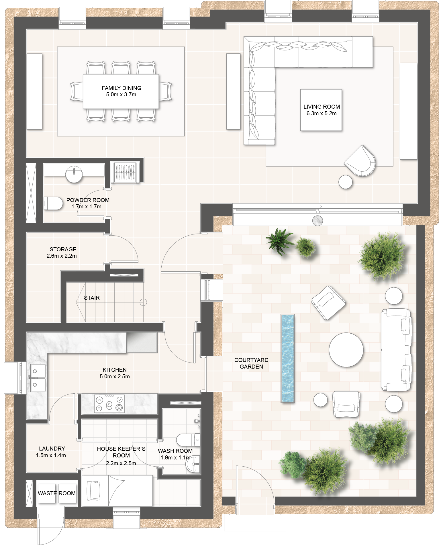 Premium villas with family-oriented layouts, featuring marble floors, high-end appliances, and private courtyards.